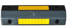 Silver wheel stopper made of polypropylene plastic with yellow reflective tape with microspheres measuring 500x160x80 mm.